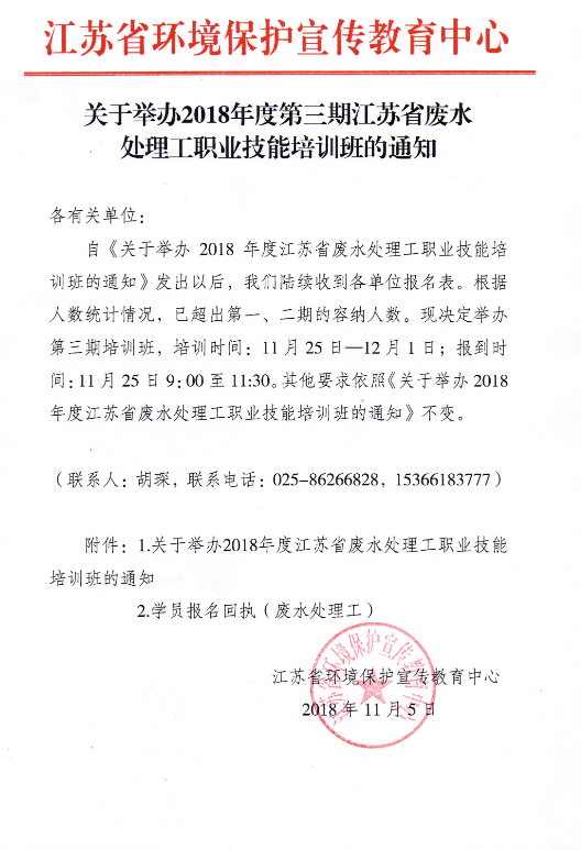 关于举办2018年度第三期江苏省废水处理工职业技能培训班的通知