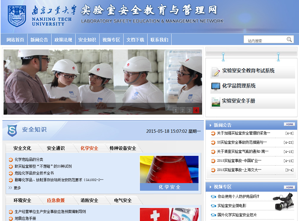 为响应南工建设“综合性、研究型、全球化”大学的号召,积极学习国内外高校实验室先进的管理经验,打造全方位的实验室管理体系,构建安全教育管理长效机制,资源保障部实验室管理办公室推出了南京工业大学实验室安全教育与管理网 (网址:http://202.119.249.22/)。在历经近一年的调研、开发和试运行,于近日正式上线。