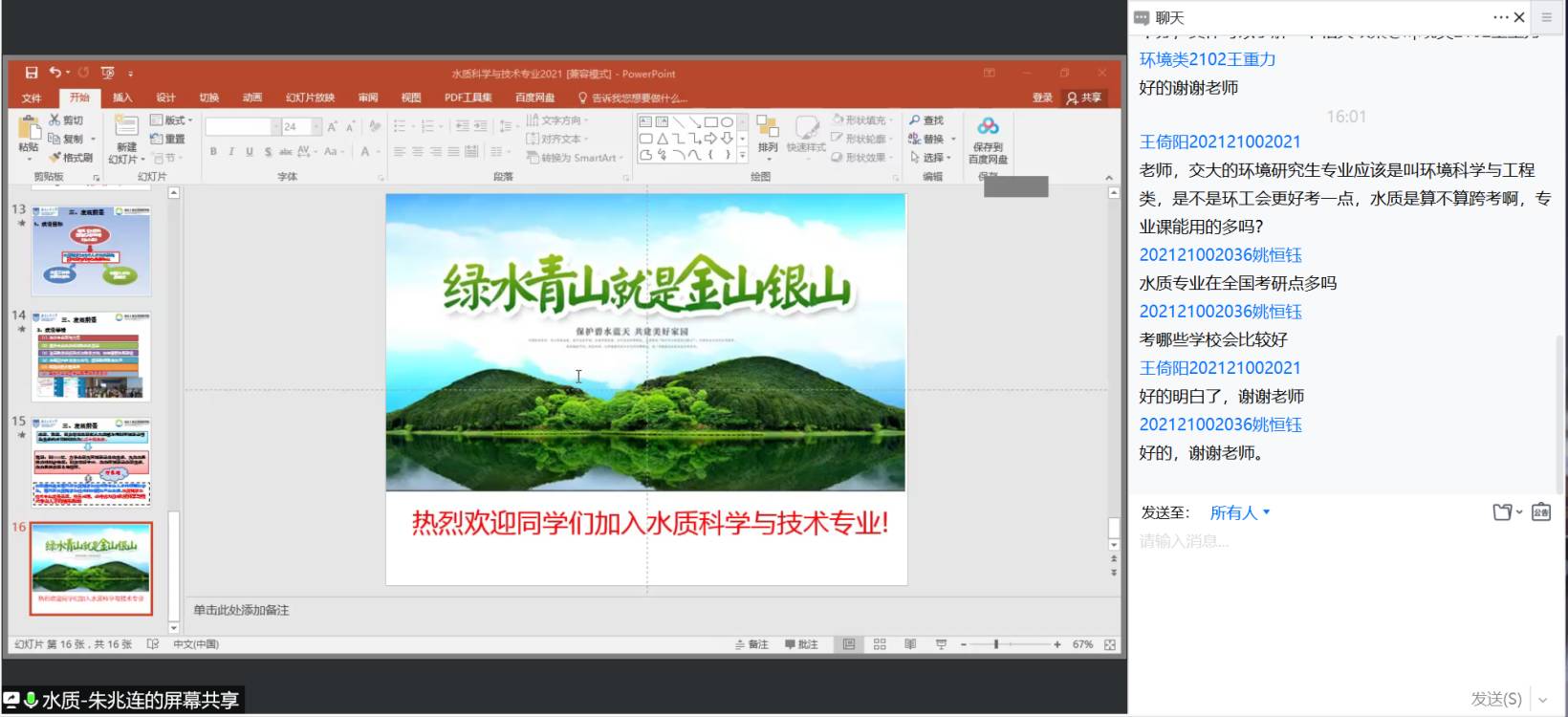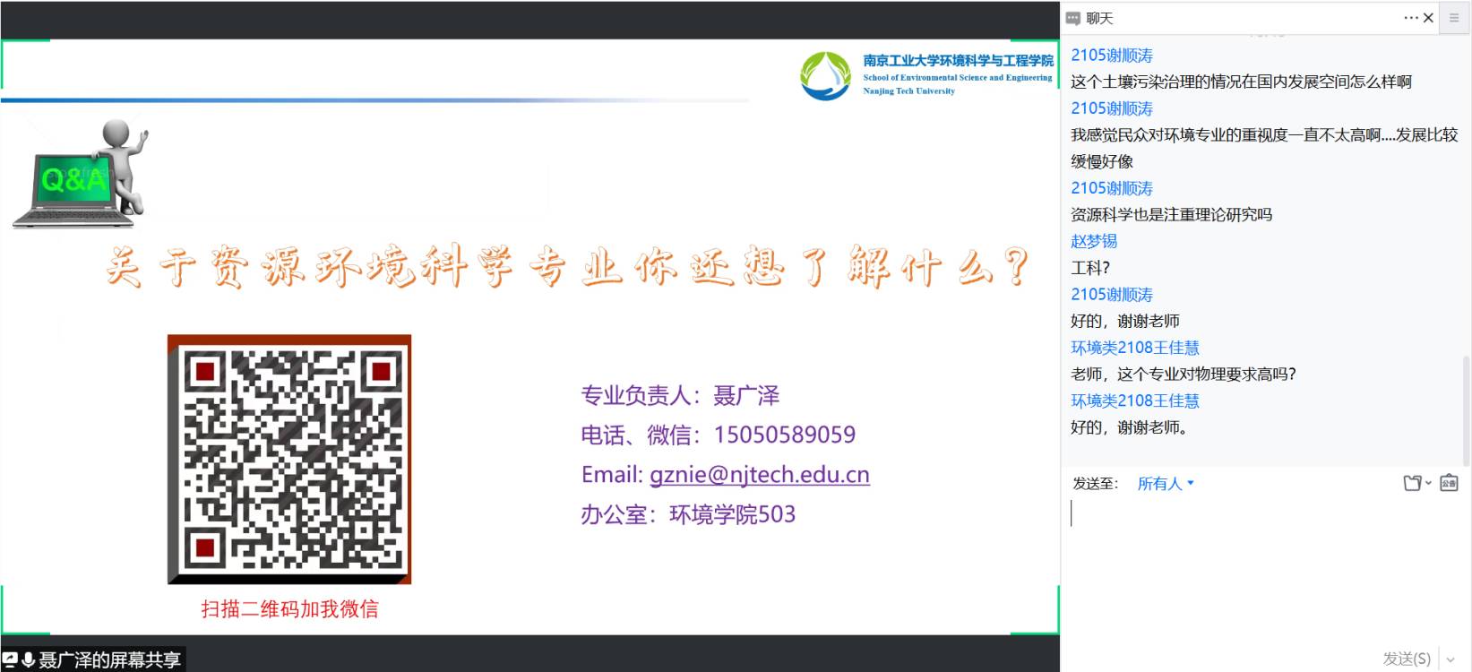 4月13日下午2:00,金沙js4399首页举办了线上大类分流宣讲会。环境科学系主任张宇峰老师、环境工程系主任赵贤广老师、水质科学与技术系主任朱兆连老师、资源环境科学系主任聂广泽老师、21级辅导员陈亚会老师以及21级全体同学共同参与。