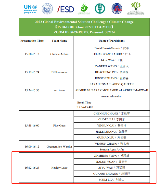 6月2日-5日,由联合国环境署、同济大学主办的2022国际学生环境与可持续发展大会暨全球学生环境挑战大赛于云端胜利召开。由我院赵贤广教授指导,20届校友杨瑾晟带队,环境工程专业刘美力、庄冠巨、万紫钰和环境科学专业樊奕晨、袁家伦5位学子组建的“Healthy Lake”团队,同来自全球43个国家的近300多位青年学子和高校负责人等参加了本次盛会。
