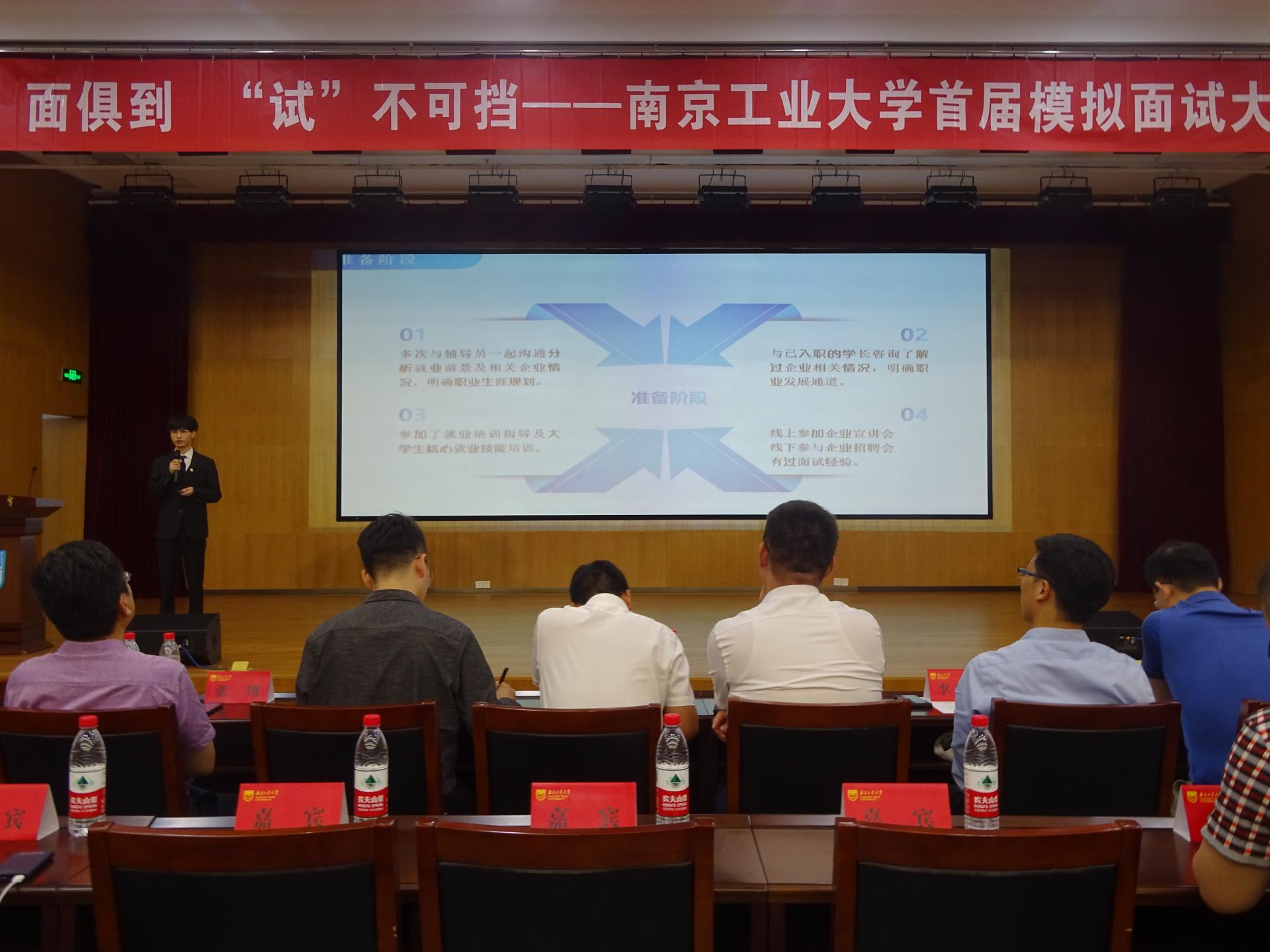 6月9日晚,由南京工业大学党委学生工作部主办,金沙js4399首页承办的“面”面俱到,“试”不可挡- 南京工业大学首届模拟面试大赛在笃学楼报告厅顺利开展。南京地铁集团人力资源部主管李月飞、中建安装集团有限公司人力资源部高级经理吴文杰、中建八局第三建设有限公司人资资源部经理陈曦、江苏中博通信有限公司人力资源主管梅红源、中石化扬子石化有限公司党委组织部招聘专员胡皓、南京工业大学党委学生工作处副处长张翔、各学院党委副书记、校就业办老师、各学院模拟面试大赛指导老师,以及学生代表共同参与本次活动。