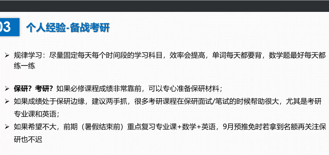 会议伊始,主持人向大家介绍了三位优秀学子的升学情况。王盛炀同学结合自己的考研经历,就为什么考研以及如何考研等问题做了详细讲解,他根据本专业学习特点和今明两年考研形势的变化,分享了自己的暑期考研复习安排。郎涛同学结合自己的推免升学经历,深入讲解了推免要求及注意事项并给同学们送上“一研为定,一定成研”的祝福。代浩汐同学从个人备考体会经验出发,强调效率比时间更加重要,应该制定自己的学习计划,不能盲从。分享会最后,同学们积极提出自己的问题,三位同学耐心解答,氛围热烈。