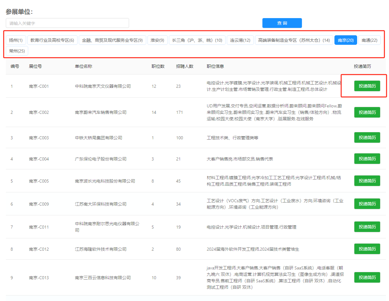 可以在招聘会页面上选择各类招聘专区,查询相关参会用人单位的招聘信息,点击投递简历进行在线投递,参会单位会同步收到您投递的简历。