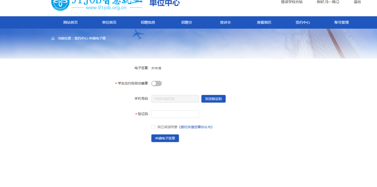 学校审核通过后单位如需要盖电子章则需要先申请电子章,如不需要,则需要先下载协议书,打印出来线下盖章后再上传协议书。上传协议书成功或者自动盖章后,即签约完成。