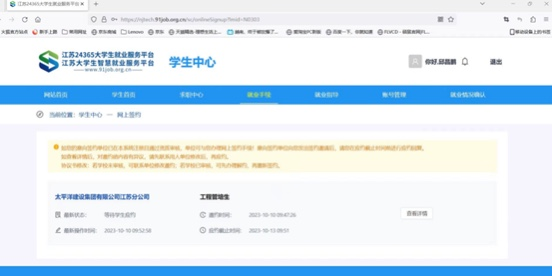 学生登录南京工业大学就业信息服务平台(https://njtech.91job.org.cn/),在“学生首页”界面,点击“签约中”,预览邀约内容,确认无误后,手写签名完成签约。