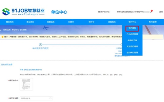 备注:如果用人单位已经注册但未开通网上签约,请进入“签约中心”的“签约授权”版块,下载《网上签约授权委托书》,填写信息盖章后提交审核。