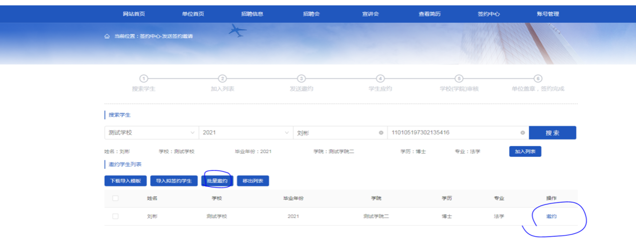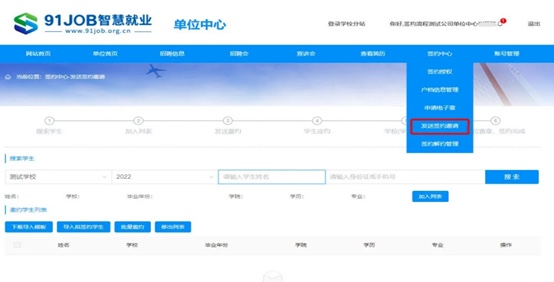 用人单位进入“签约中心”的“发送签约邀请”版块,搜索意向毕业生信息,发送签约邀请。如需对多位毕业生发起邀约,可批量邀请。