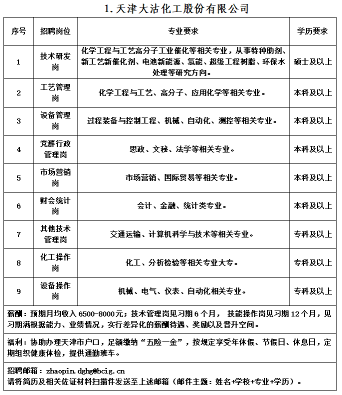 (一)应聘基本条件2024年全国普通高等院校统招统分应届毕业生(定向、委培除外),身体健康,遵纪守法,品行端正,无不良行为记录,有较强的责任心和学习能力,具备良好的沟通协调能力和团队协作精神,热爱化工事业。同等条件下优先招聘中共党员、综合素质好、学习成绩优异以及具有班级管理、学生会工作经验的毕业生。学历要求:技术管理岗位要求本科及以上学历,技能操作岗位要求大专及以上学历。工作地点:天津市