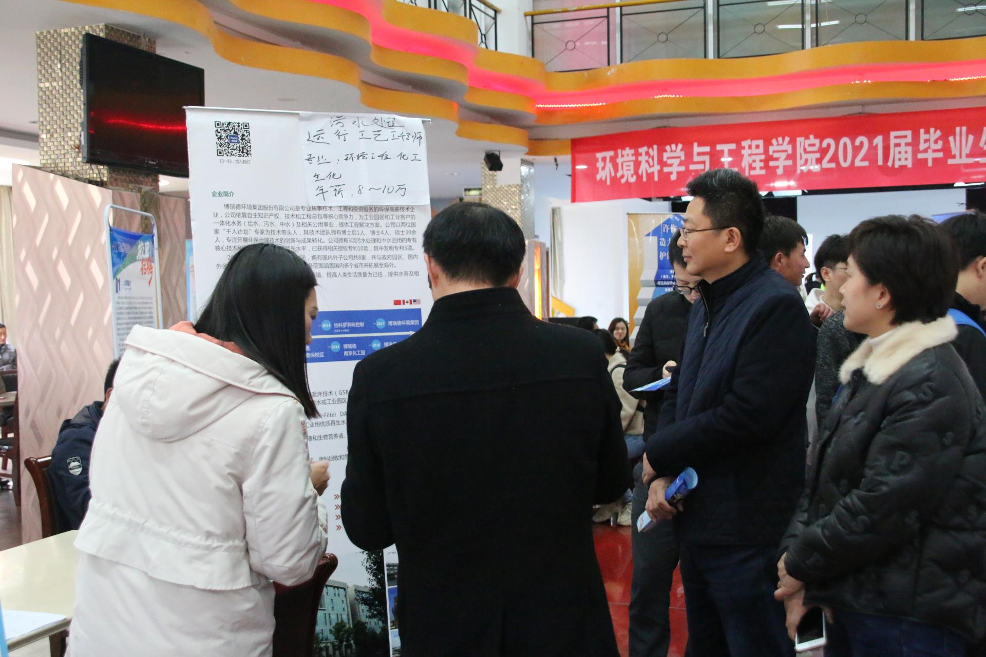 学校学生处处长黎能进、副处长张翔,学院领导周华、仲兆祥、张雪英、徐海涛、张莼波,环境工程研究院院长徐炎华,以及兄弟学院领导前往招聘会现场,细心询问招聘单位详细情况,并与前来应聘的同学进行交流。学院2021届本科生、研究生以及学校其他相关专业毕业生前来应聘,与用人单位就岗位要求、工作环境、福利待遇、交通条件等方面深入沟通,表现出了积极的签约意向。经调查问卷反馈,用人单位普遍反映我院毕业生专业基础扎实、综合素质较高,初步统计,企业共收取学生简历800余份,我院多名同学当场与用人单位签订了就业意向。