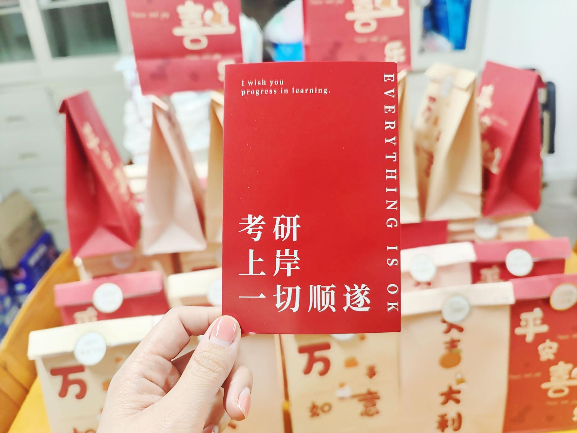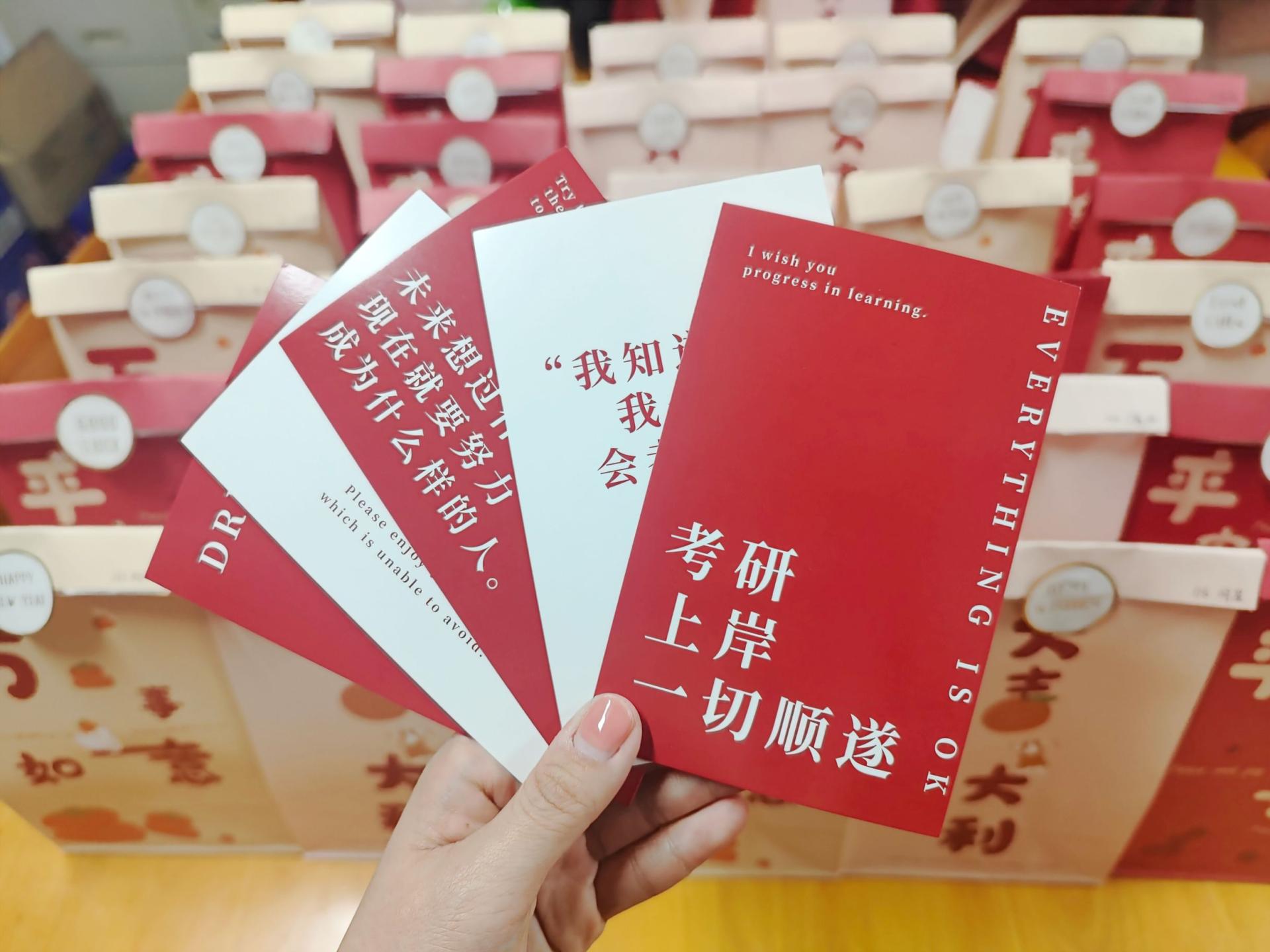 活动现场,张书记代表学院向正在备考考研同学表达了关心和期待,希望大家在最后几天时间继续加油,踢好“临门一脚”,同时也要注意劳逸结合、注意身体,以一个积极健康的状态进入考场。随后,学院领导和老师们为同学们送上了巧克力、辅导员亲笔写祝福明信片等小礼物,将温暖送到每一位考研学子手上。考研学子们倍受鼓舞,表示会加倍努力,争取考出好成绩,不辜负学院领导和老师的期待。