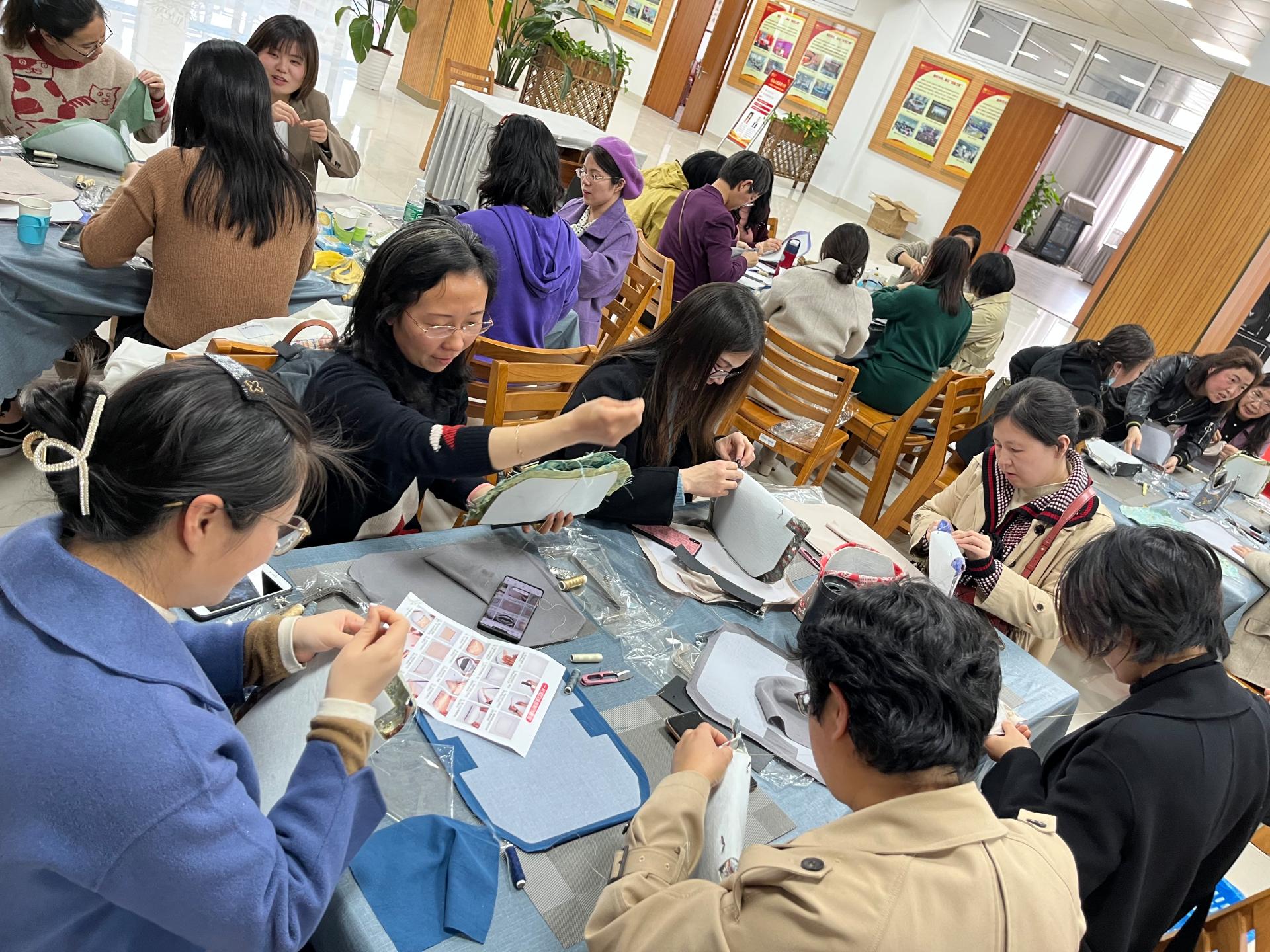 活动伊始,校工会彭亚辉主席致辞,宣布活动开始。随后,城建学院分工会主席陈薇介绍手工包起源、历史和文化。在交通学院分工会主席闵珍的指导下,大家饶有兴致的体验手工包的制作工艺,在缝制过程中,大家边学边做边交流,一起发现中国传统女红艺术之美,探寻动手创作乐趣。经过2小时的耐心缝制,女教职工们亲手完成了自己的节日礼物,欢声笑语充满整个活动现场。