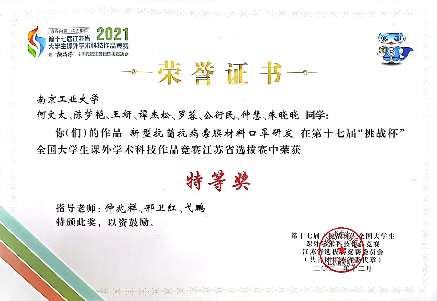 在3月26日-28日由共青团中央、中国科协、教育部、中国社会科学院、全国学联、四川省人民政府共同主办,四川大学承办的第十七届“挑战杯”全国大学生课外学术科技作品竞赛终审决赛中,我院仲兆祥教授指导作品《新型抗菌抗病毒膜材料口罩研发》获得国赛二等奖,获奖证书于近日颁发。早在2021年5月,该项作品在第十七届“挑战杯”大学生课外学术科技作品江苏省选拔赛中荣获省赛特等奖。