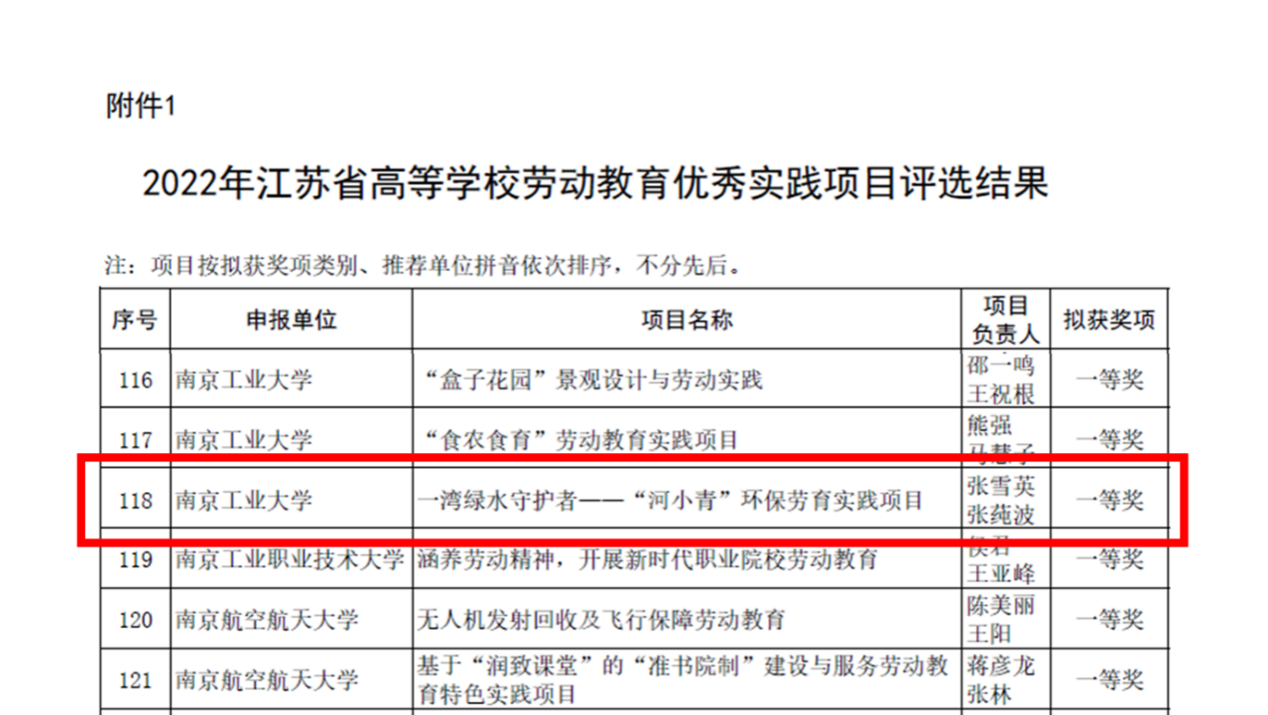 近日,江苏省高等教育学会公布了2022年江苏省高等学校劳动教育优秀实践项目评选结果,本次评选全省共359个项目参评,经学会组织专家组评议、评审工作组审定、公示,我院《一湾绿水守护者——“河小青”环保劳育实践项目》荣获一等奖。