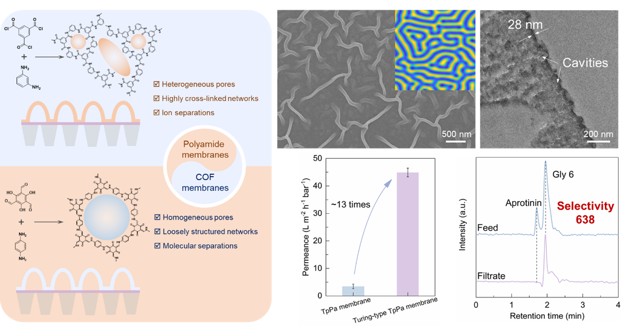 1952年,“计算机科学之父”艾伦·图灵提出了一种反应-扩散模型,即一对活化剂和抑制剂在一定条件下发生相互反应、扩散,产生远离热力学平衡的图灵结构。对于分离膜,图灵结构的关键特征为膜内部的纳米空腔,可大幅提升渗透性。传统图灵结构膜的交联度高、且缺乏规整孔道,难以实现分子的快速、精准分离。共价有机框架(COF)具有规整、适宜的孔道,但成膜单体反应速率较低,且难以达到图灵结构形成的阈值。