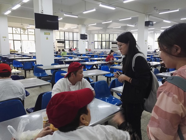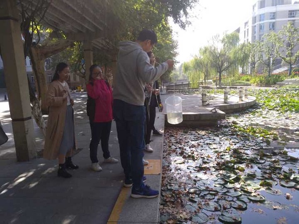 第三阶段10月27日,重点通过对西苑“抹茶湖”进行的水体采样、采访周边师生(结合线上问卷)等途径,向众人展示“抹茶湖”水的色度浊度等较直观的属性,唤起身边同学的环保意识,使大家能够从自己做起,保护环境、美化校园环境。党支部全体学生党员按照预定时间在西苑食堂门口集合,带上提前准备好的绳子、水桶、密封袋等工具,分成两组开始进行调研活动。一组人进行“抹茶湖”采样工作。虽然步骤不免有些繁琐,甚至所取的水样还有些异味。但是小组成员都非常敬业,完成了各个采样点的采样工作。另一组同学则是分头采访食堂工作人员、宿管阿姨及路过的同学等,向他们了解平时对“抹茶湖”的印象及了解情况。完成各自工作后,两组同学汇合并将所采集水样的密封袋贴于展板上,向路过的师生展示“抹茶湖”不同位置水样的现状,让大家通过直观的视觉感受,意识到保护校园水体的重要性。同时支部成员也向大家分享了校园生活中水体保护的相关知识,并引导同学们在活动海报上写下自己的环保宣言,征集改善校园水环境的建议。