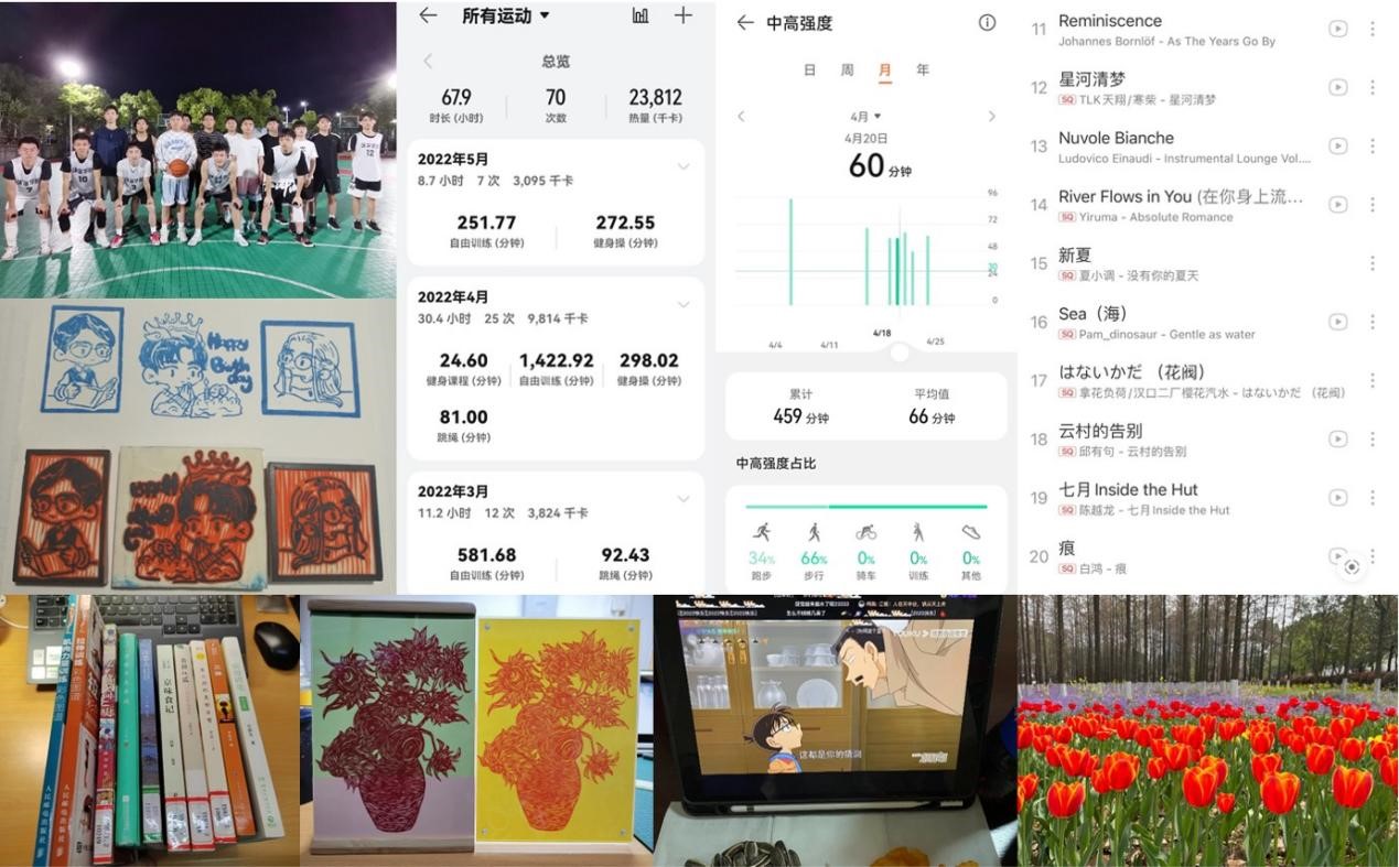 为进一步提升我院研究生心理健康水平,以良好的风貌迎接党的二十大,我院硕士研究生第一党支部开展了喜迎二十大 心理健康教育系列活动,以自己的亲身经历与感悟,希望帮助更多的同学找寻健康的生活方式,纾解心中郁结。活动从4月下旬开始,持续时间一个月,每位支部党员都选择了适合自己的方式健康生活,释放心理压力。有的同学选择以运动的形式释放压力,在大汗淋漓之余享受痛快;有的同学选择手工制作,让心灵和双手同时静下来,用完成作品的成就感来满足自己;还有的同学选择更简单、更直接的方式——看书、看剧、赏花、听歌,在生活中多去发现美好的事物,学习更多的知识,充实了自己的大脑,自然也就不会感到焦躁。正所谓——温柔的一半源于知识。