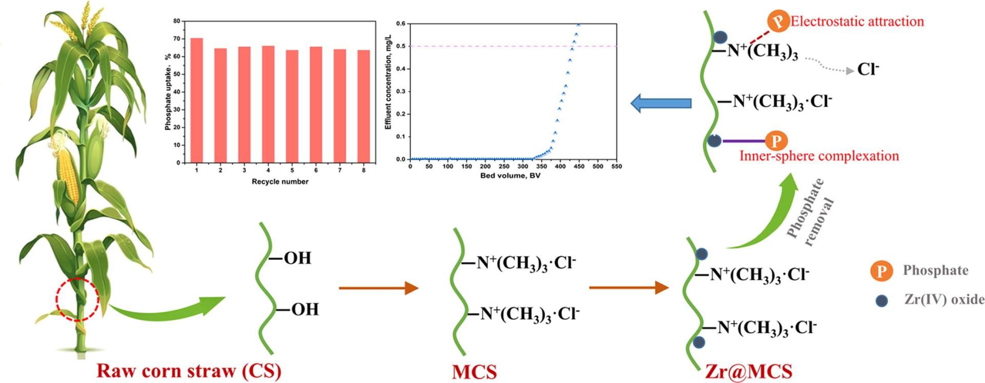 近期,我院聂广泽老师课题组以典型农业废弃物玉米秸秆为原料,首先以经济绿色的改性工艺制备了一种生物质阴离子交换剂MCS载体,在此基础上通过“前驱体导入-原位沉积”的方法在MCS孔道和表面负载纳米尺寸的锆氧化物,得到了一种新型的生物质基纳米除磷复合材料Zr@MCS。研究表明该材料除磷选择性强、吸附容量大、再生后可循环使用,且脱附浓缩液通过鸟粪石结晶法可获得高纯度的磷肥,实现了水中磷酸盐的高效去除和回收;同时,该复合材料以农业废弃物原料制备,不仅成本低廉,而且实现了秸秆的资源化,达到了以废治废的目的。本研究可为开发清洁制备的低成本高效率净水纳米复合材料提供参考。