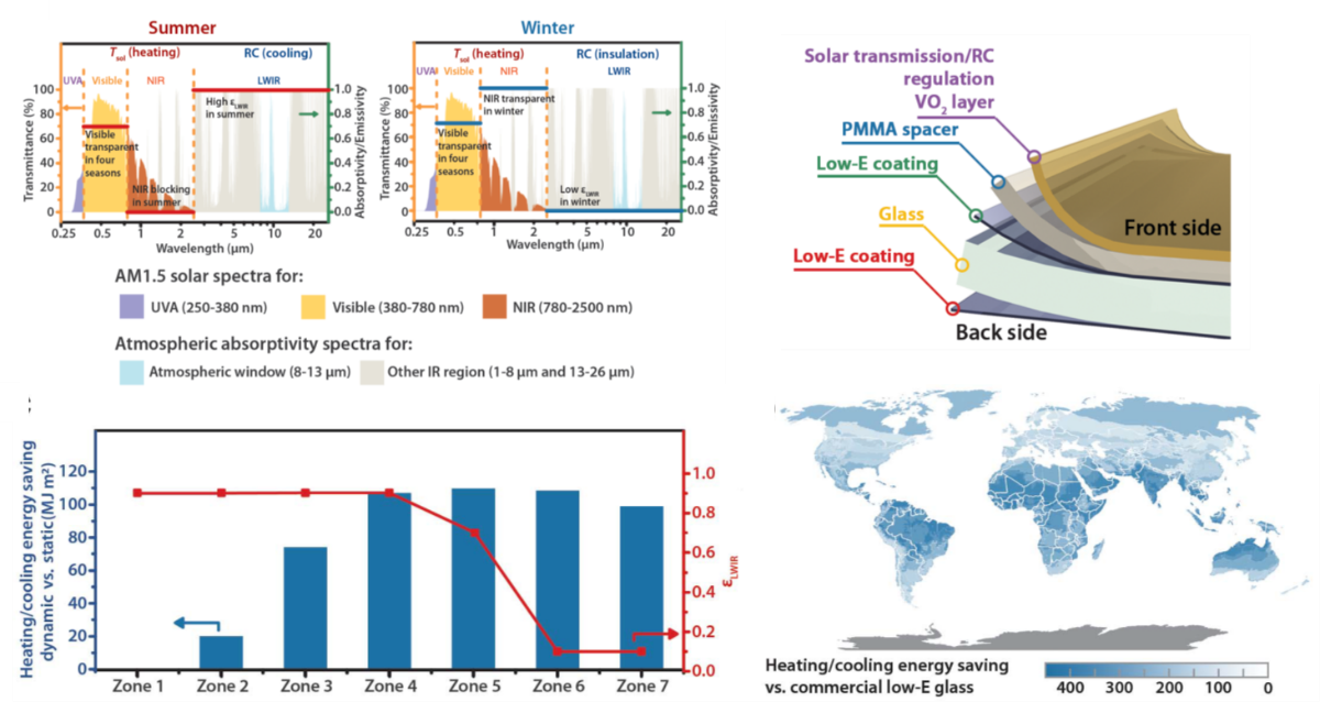 针对此问题,我院蒋腾耀副教授与新加坡南洋理工大学、美国怀俄明大学等合作团队首先提出了同时调控太阳光和长波红外线两个波段的理想智能窗户模型。相较于传统智能窗户只考虑太阳光波段的调控,多波段同时调控的智能窗户能够实现更优秀的建筑节能效果。基于此模型,研究团队设计并制备了一款双波段调控自响应智能窗。该窗户利用热响应钨掺杂二氧化钒纳米颗粒、聚甲基丙烯酸甲酯以及氧化铟锡涂层构成了一个法布里-珀罗谐振器,实现对于太阳光和长波红外线的双波段自响应调控,适用外界气温的变化。在建筑节能模拟中,该智能窗显示出比市售低辐射节能玻璃更优异的节能效果,实现了最高达324.6MJ/m2的制冷/制热节能。这项研究成果为智能节能建筑围护结构尤其是节能玻璃的发展提供了新的思路,同时也为全球的节能减碳事业贡献了独特的解决方案。