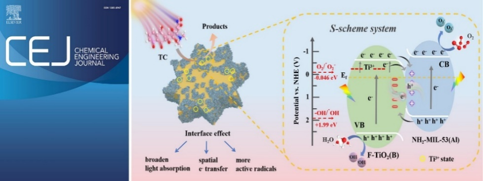 我院徐海涛教授团队受邀在国际著名期刊《Chemical Engineering Journal》(IF=16.744, 一区)上发表题为“Ultrathin fluorine-doped TiO2(B) nanosheets-anchored hierarchical cog wheel-shaped NH2-MIL-53(Al) for boosting photocatalytic activity”研究。在团队前期工作(Compos. Part B: Eng. 2022, 242, 110082, IF=11.32, 一区)基础上,联合澳大利亚阿德莱德大学Shaobin Wang教授成功构筑出F掺杂亚稳相TiO2(B)纳米薄片锚定的齿轮状NH2-MIL-53(Al)新型S型异质结,并系统探讨了材料表面缺陷、界面电子相互作用及载流子空间分离路径等因素在模拟太阳光照射下降解目标物的协同效应。研究表明,该异质结对四环素的降解效率为94.7%、TOC去除率高达71.4%,具备良好的Cu2+、NO3−离子抗干扰能力,同时采用HPLC-MS检测和DFT理论计算揭示了四环素的光降解途经。
