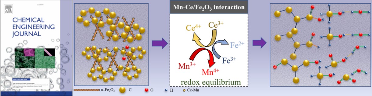 我院徐海涛教授团队在国际著名期刊《Chemical Engineering Journal》(一区,影响因子15.1)上发表了题为“Bimetallic Mn-Ce oxides modified α-Fe2O3 nanorods for low temperature catalytic thermal desorption of naphthalene in soil”的研究成果。在团队前期工作(Journal of Rare Earths 2023, DOI: 10.1016/j.jre.2023.10.016, 一区)基础上,成功制备出Mn-Ce固溶体改性α-Fe2O3纳米棒以实现萘污染土壤的高效强化修复,并深入探讨了多种因素对土壤中萘去除性能的影响。研究表明,该催化剂在180 ℃实现土壤中萘的去除率高达99.96%,相较于未添加催化剂的土壤样品,脱附温度平均降低了60 ℃。此外,联用GC-MS和DRIFTS对降解产物进行了检测,系统分析了催化热脱附脱除土壤中萘的降解机理。
