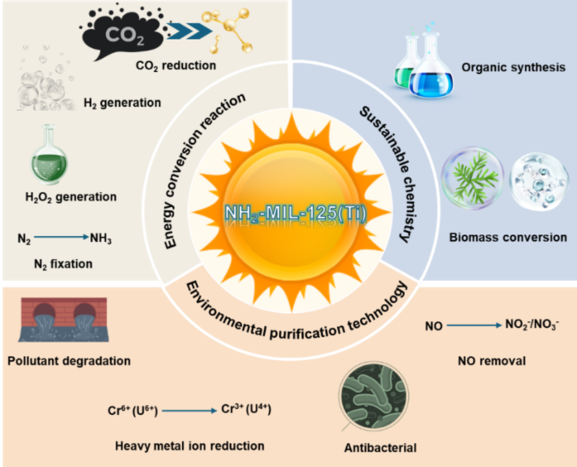 NH2-MIL-125(Ti)作为一种钛基MOFs,因其特殊结构和功能特性(如氨基官能化、高比表面积和多孔性、高效电荷分离、可见光吸收、活性氧生成、选择性吸附、热稳定性、低毒性等),在环境修复、可再生能源生产和绿色化学等领域备受关注。